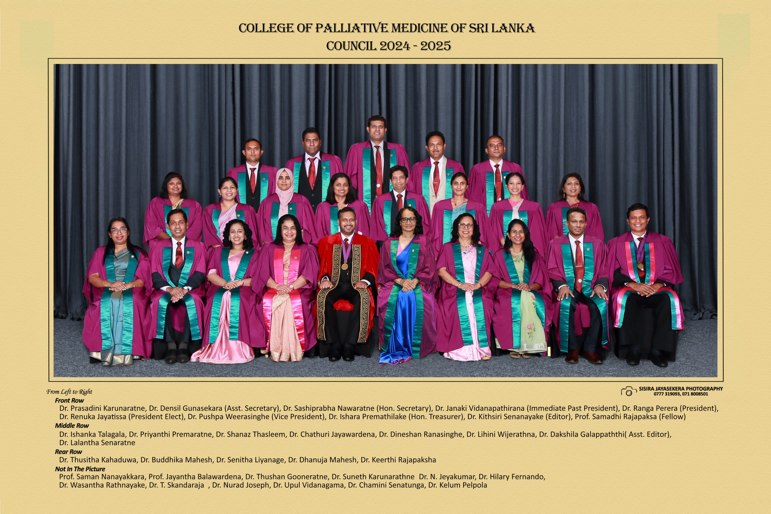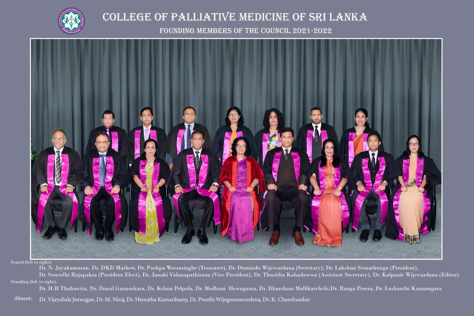 President – Dr. Renuka Jayatissa, President-Elect – Dr. Pushpa Weerasinghe, Vice President – Dr. Densil Gunasekara, Secretary – Dr. Buddhini Denuwara, Treasurer – Dr. Yasoma Weerasekara, Editor – Dr. Dakshila Galappatti, Assistant Secretary – Dr. K.D.S.N. Wijeratne, Assistant Editor – Dr. Hasith Fernando